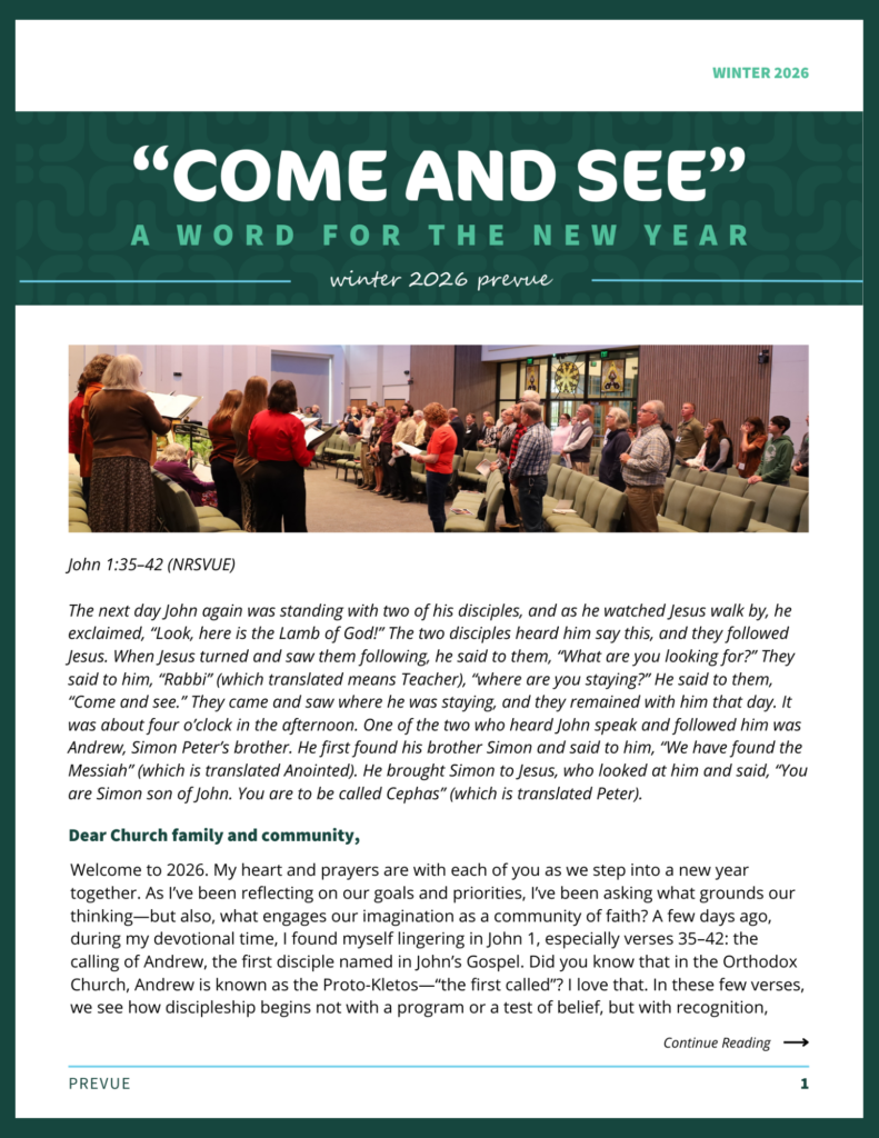 In this edition of the Prevue, Pastor Duane Carlisle invites us into 2026 with a “come and see” reflection that sets the tone for a year of welcome and deeper connection. Inside, you’ll find an announcement about our new grant-funded website, an introduction to Family Ministry Team Member Milly Coolman, and a heartfelt story that reminds us why community matters. We also look back with gratitude on We’re Out 2025, Breakfast with Santa, and Lafayette Urban Ministry’s Jubilee Christmas as we continue living out First Church’s mission to love, include, and serve.