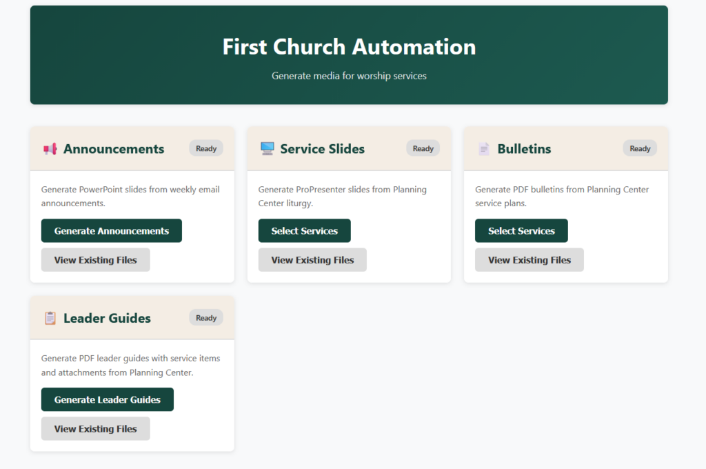- Building a custom application that automatically generates weekly announcements, worship slides, bulletins, and leader guides
